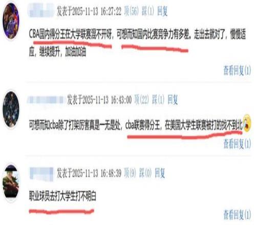 對于林葳而言,他似乎已經在教練組眼里出現了信任危機。NCAA生涯前三戰,他合計17中1,三分球10中0,僅得到7分。作為CBA聯賽的本土得分王,林葳在NCAA卻遭遇拿到兩位數得分都很困難的窘境,這從另一個角度也凸顯了國內聯賽的競爭力有多差。不少球迷也直言:職業球員去打大學生都打不明白。